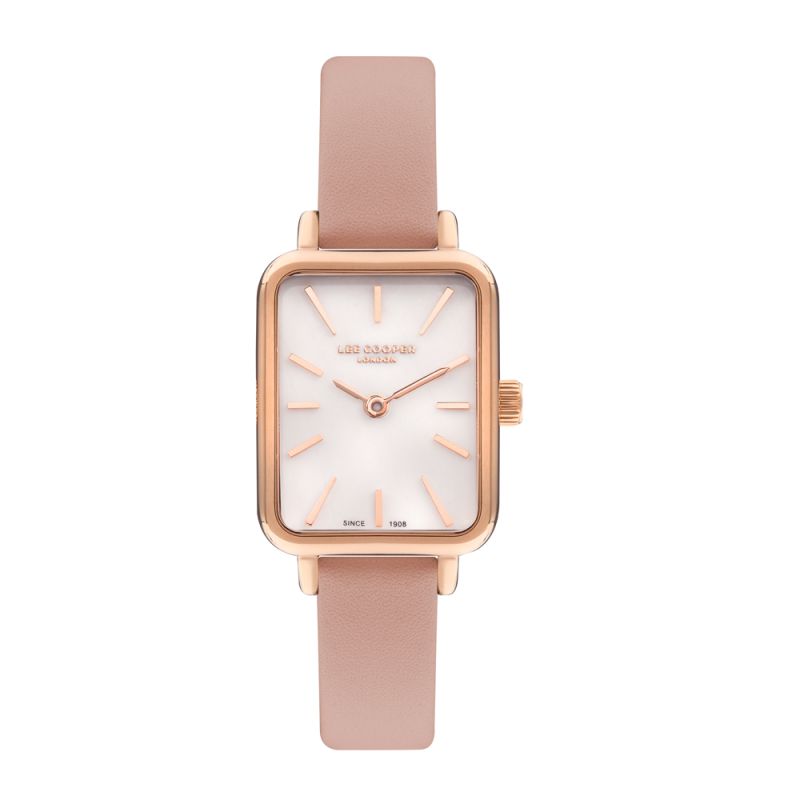 Дамски часовник Lee Cooper със спортно-елегантен дизайн от колекцията Elegance. Седефен циферблат със стрелки и индекси в цвят розово злато. Стъкло минерал-кристал. Корпус изработен от супер метал. Каишка от естествена кожа. Часовникът се задвижва от кварцов механизъм. Водоустойчивост 3 ATM - допускат се леки пръски, не се препоръчва обилно мокрене.