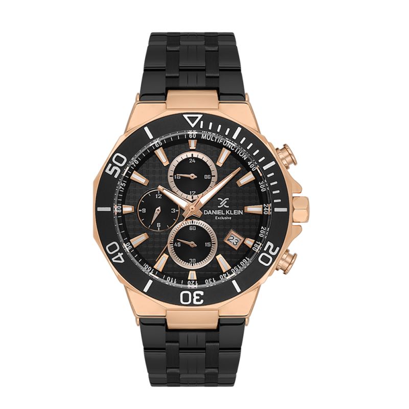 Страхотен модел мъжки часовник Daniel Klein със спортно-ежедневен дизайн от колекцията Exclusive. Мултифункционален дисплей в черен цвят с детайли в цвят розово злато. Стъкло минерал-кристал. Луминесцентно покритие върху стрелките и индексите. Диаметър на корпуса 44 мм. Часовникът е с метален корпус и верижка от неръждаема стомана. Задвижва се от кварцов механизъм. Водоустойчивост 5 ATM - допускат се леки пръски и взимане на душ, не се препоръчва обилно мокрене.