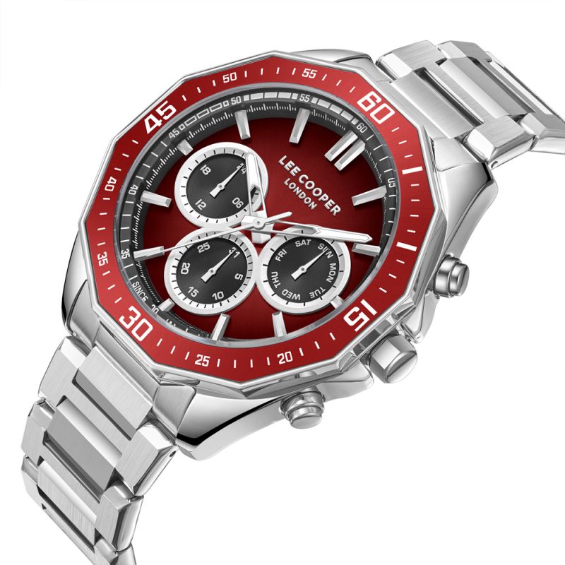 Спортно-елегантен мъжки часовник Lee Cooper с мултифункционален дисплей. Моделът е с корпус от супер метал и верижка от неръждаема стомана. Стъкло минерал-кристал. Задвижва се от кварцов механизъм. Водоустойчивост 5 ATM - допускат се леки пръски и взимане на душ, не се препоръчва обилно мокрене.