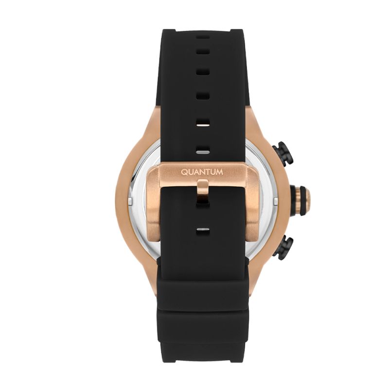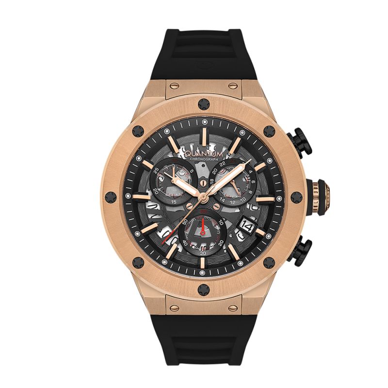 Спортен модел мъжки часовник Quantum. Дисплей комбинация от хронограф и скелетон с интересен дизайн. Стъкло минерал-кристал с антирефлексно покритие. Корпус от неръждаема стомана в комбинация със силиконова каишка. Кварцов механизъм. Водоустойчивост 10 ATM - позволява мокрене, къпане и плуване във водни басейни.