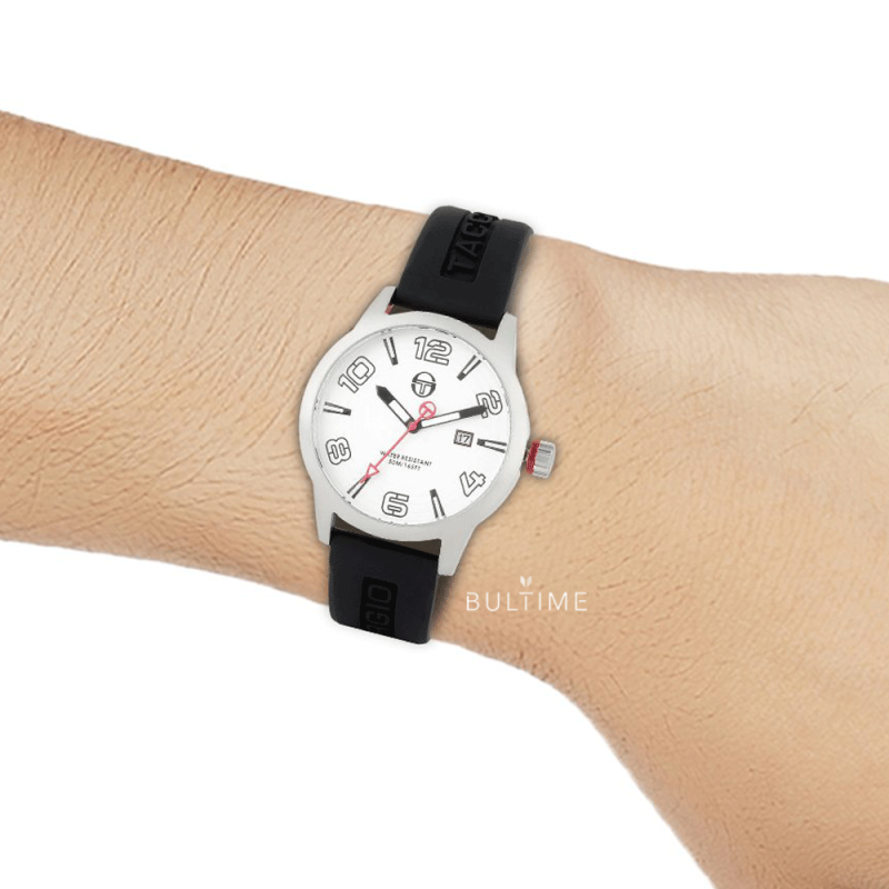 Мъжки часовник Sergio Tacchini със спортна визия. Аналогов дисплей с показател за дата и фосфоресциращи стрелки и индекси. Минерално стъкло, устойчиво на надраскване. Корпус от неръждаема стомана. Черна силиконова каишка. Кварцов механизъм. Водоустойчивост 5 ATM - допускат се леки пръски и взимане на душ, не се препоръчва обилно мокрене.