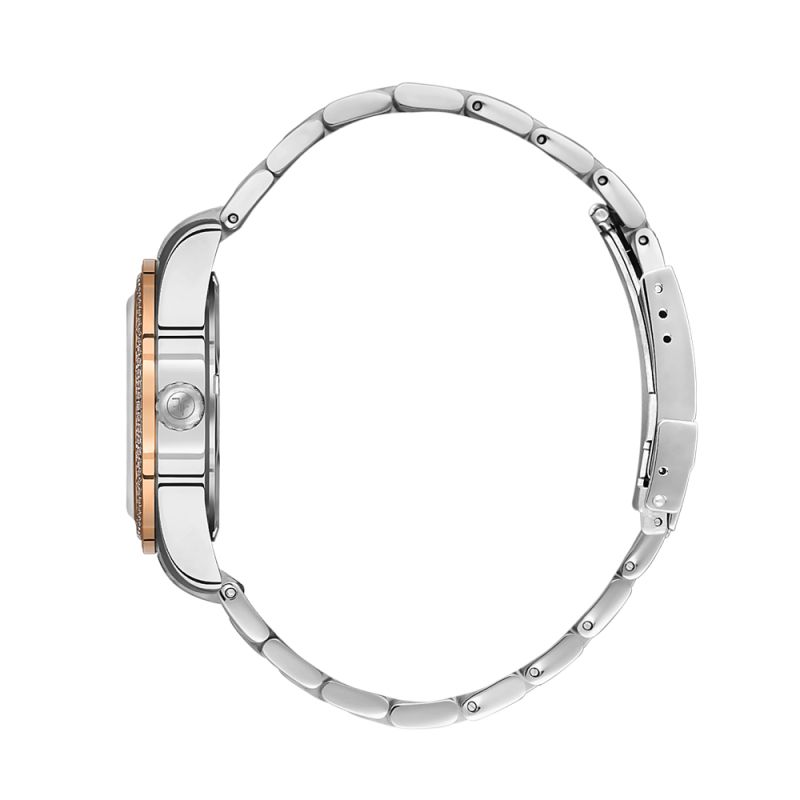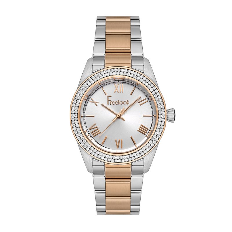 Дамски часовник Freelook с богата декорация от кристали по безела. Сребрист аналогов дисплей с детайли в цвят розово злато. Стъкло минерал-кристал. Корпус и верижка от неръждаема стомана. Задвижва се от кварцов механизъм. Водоустойчивост 5 ATM - допускат се леки пръски и взимане на душ, не се препоръчва обилно мокрене.