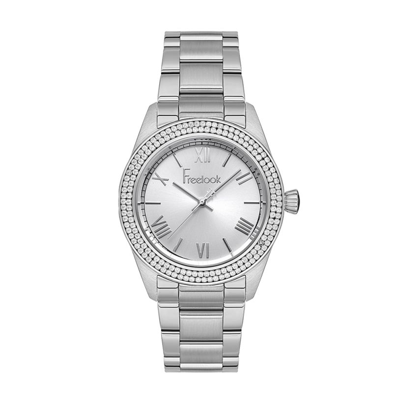 Дамски часовник Freelook с богата декорация от кристали по безела. Сребрист аналогов дисплей. Стъкло минерал-кристал. Корпус и верижка от неръждаема стомана. Задвижва се от кварцов механизъм. Водоустойчивост 5 ATM - допускат се леки пръски и взимане на душ, не се препоръчва обилно мокрене.