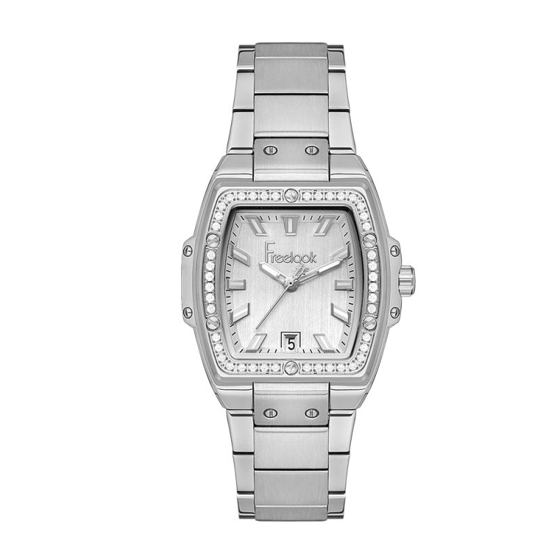 Дамски часовник Freelook със спортно-елегантен дизайн от колекцията Charmant. Моделът е със сребрист аналогов дисплей с показател за дата и декорация от кристали по безела. Стъкло минерал-кристал. Корпус и верижка от неръждаема стомана. Кварцов механизъм. Водоустойчивост 5 ATM - допускат се леки пръски и взимане на душ, не се препоръчва обилно мокрене.