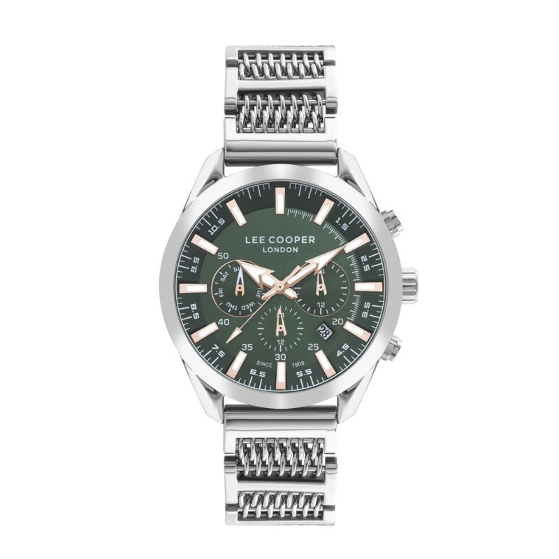Мъжки часовник Lee Cooper с корпус от супер метал. Тъмнозелен мултифункционален дисплей с фосфоресциращи стрелки и индекси. Стъкло минерал-кристал. Сребриста метална верижка. Задвижва се от кварцов механизъм. Водоустойчивост 5 ATM - допускат се леки пръски и взимане на душ, не се препоръчва обилно мокрене.