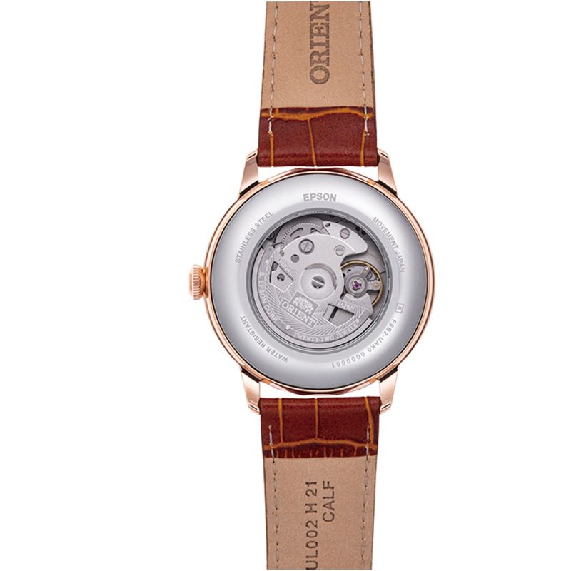 Мъжки часовник Orient със стилен дизайн. Корпус от неръждаема стомана в комбинация с кафява каишка от естествена кожа. Аналогов дисплей с показател за дата, ден от седмицата и индикатор слънце/луна. Стъкло минерал-кристал. Автоматичен механизъм Cal.F6B24. Водоустойчивост 3 ATM - допускат се леки пръски, не се препоръчва обилно мокрене.