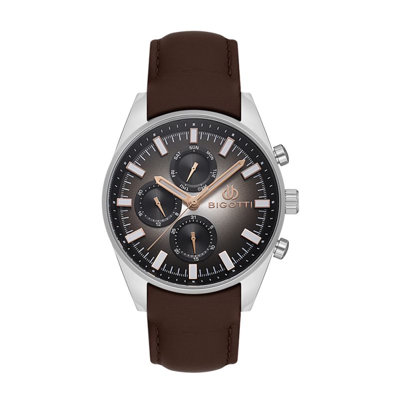 Мъжки часовник Bigotti със стилен дизайн. Метален корпус в комбинация с каишка от естествена кожа. Мултифункционален дисплей с луминисцентно покритие на стрелките и индексите. Стъкло минерал-кристал. Кварцов механизъм. Водоустойчивост 5 ATM - допускат се леки пръски и взимане на душ, не се препоръчва обилно мокрене.