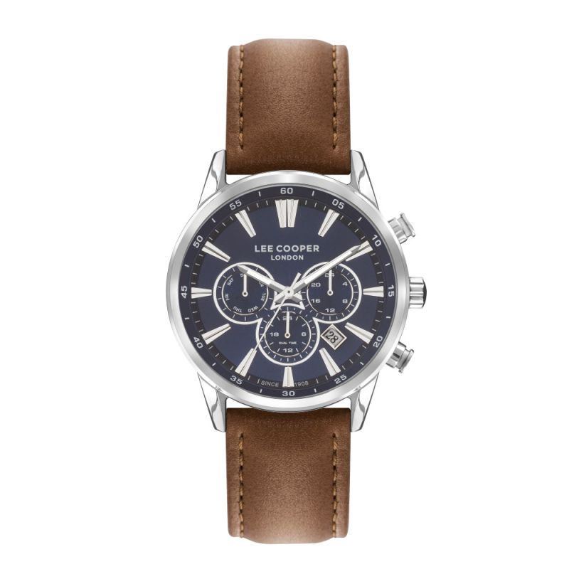Мъжки часовник Lee Cooper със спортно-елегантна визия. Моделът е със син мултифункционален дисплей, съчетан с кафява каишка от естествена кожа. Корпус от супер метал и стъкло минерал-кристал. Задвижва се от кварцов механизъм. Водоустойчивост 5 ATM - допускат се леки пръски и взимане на душ, не се препоръчва обилно мокрене.