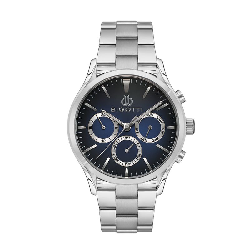 Спортно-елегантен мъжки часовник Bigotti с мултифункционален дисплей. Моделът е с метален корпус и верижка от неръждаема стомана. Стъклото е минерал-кристал. Часовникът се задвижва от кварцов механизъм. Водоустойчивост 5 ATM - допускат се леки пръски и взимане на душ, не се препоръчва обилно мокрене.