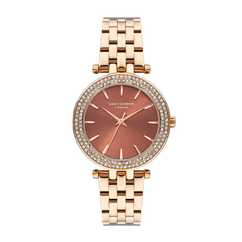 Дамски часовник Lee Cooper с богата декорация от кристали по белеза. Кафяв аналогов дисплей със стрелки и индекси в цвят розово злато. Стъкло минерал-кристал. Корпус от супер метал в комбинация с метална верижка. Моделът се задвижва от кварцов механизъм. Водоустойчивост 3 ATM - допускат се леки пръски, не се препоръчва обилно мокрене.