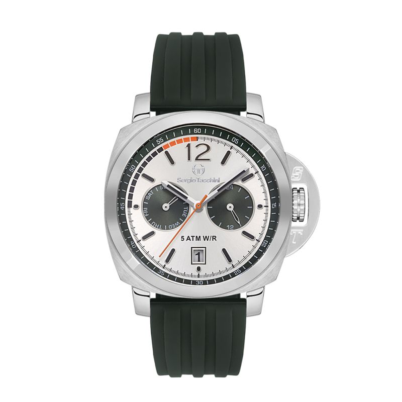 Мъжки часовник Sergio Tacchini с модерен спортен дизайн. Моделът е с мултифункционален дисплей и минерално стъкло. Корпус от неръждаема стомана в комбинация със силиконова каишка. Задвижва се от кварцов механизъм. Водоустойчивост 5 ATM - допускат се леки пръски и взимане на душ, не се препоръчва обилно мокрене.