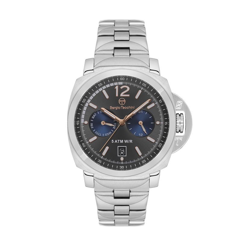 Мъжки часовник Sergio Tacchini с модерна спортно-елегантна визия. Моделът е с мултифункционален дисплей и минерално стъкло. Корпус и верижка от неръждаема стомана. Задвижва се от кварцов механизъм. Водоустойчивост 5 ATM - допускат се леки пръски и взимане на душ, не се препоръчва обилно мокрене.