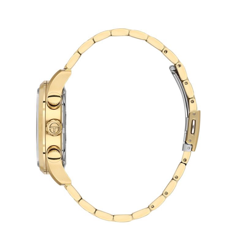 Спортно-елегантен мъжки часовник Sergio Tacchini с дисплей тип хронограф. Корпус и верижка от неръждаема стомана. Стъкло минерал-кристал. Кварцов механизъм. Водоустойчивост 5 ATM - допускат се леки пръски и взимане на душ, не се препоръчва обилно мокрене.