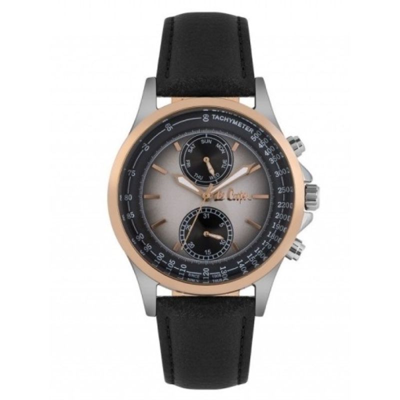 Елегантен мъжки часовник Lee Cooper от колекцията Classic Multifunction. Моделът е с мултифункционален дисплей с показатели за дата, ден и тахиметър. Корпус изработен от супер метал. Черна каишка от естествена кожа. Стъкло минерал-кристал. Кварцов механизъм. Водоустойчивост 3 ATM - допускат се леки пръски, не се препоръчва обилно мокрене.