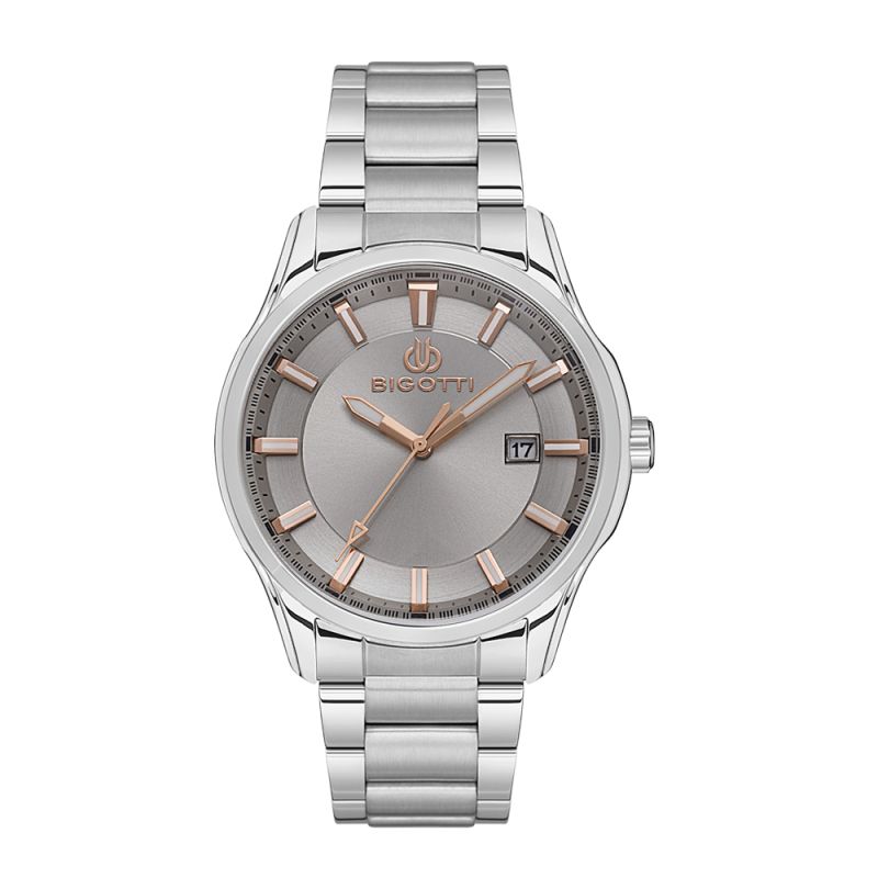 Мъжки часовник Bigotti с класически дизайн. Моделът е с метален корпус и верижка от неръждаема стомана. Аналогов дисплей със стилен дизайн и показател за дата. Стъкло минерал-кристал. Задвижва се от кварцов механизъм. Водоустойчивост 5 ATM - допускат се леки пръски и взимане на душ, не се препоръчва обилно мокрене.