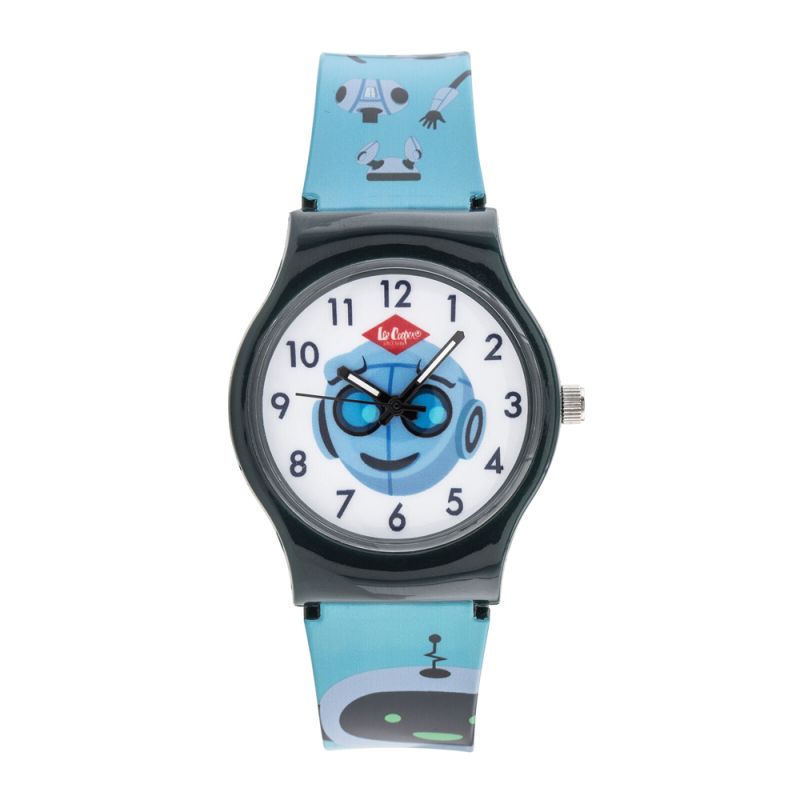 Детски часовник Lee Cooper с интересен цветен дизайн. Аналогов дисплей с илюстрация на робот. Стъкло минерал-кристал. Корпус от поликарбонат, съчетан със силиконова каишка. Задвижва се от кварцов механизъм. Водоустойчивост 3 ATM - допускат се леки пръски, не се препоръчва обилно мокрене.