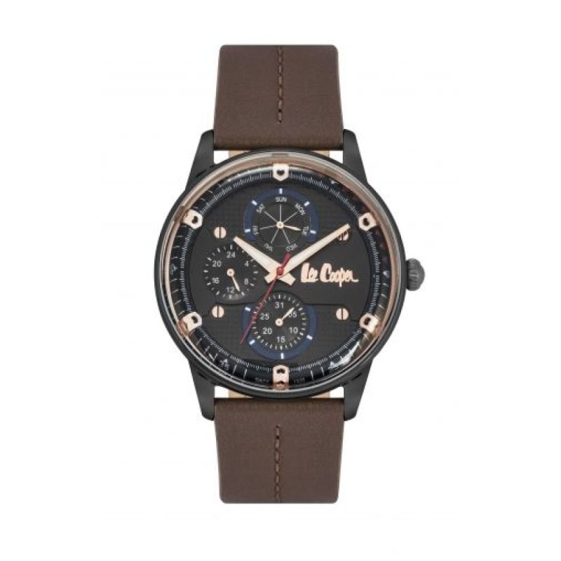 Мъжки спортно-елегантен часовник Lee Cooper с мултифункционален дисплей. Моделът е с корпус от супер метал и каишка от естествена кожа. Стъкло минерал-кристал. Задвижва се от кварцов механизъм. Водоустойчивост 3 ATM - допускат се леки пръски, не се препоръчва обилно мокрене.