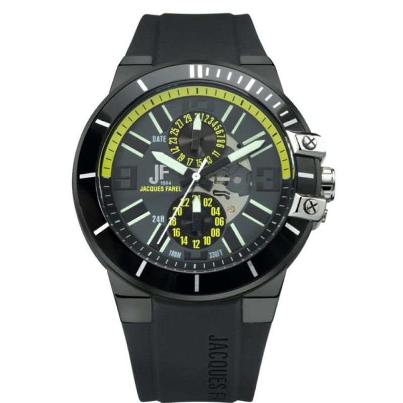 Мъжки спортен часовник Jacques Farel с мултифункционален дисплей. Моделът е с корпус от неръждаема стомана и черна силиконова каишка. Минерално стъкло с антирефлексно покритие. Кварцов механизъм. Водоустойчивост 10 ATM - позволява мокрене, къпане и плуване във водни басейни.