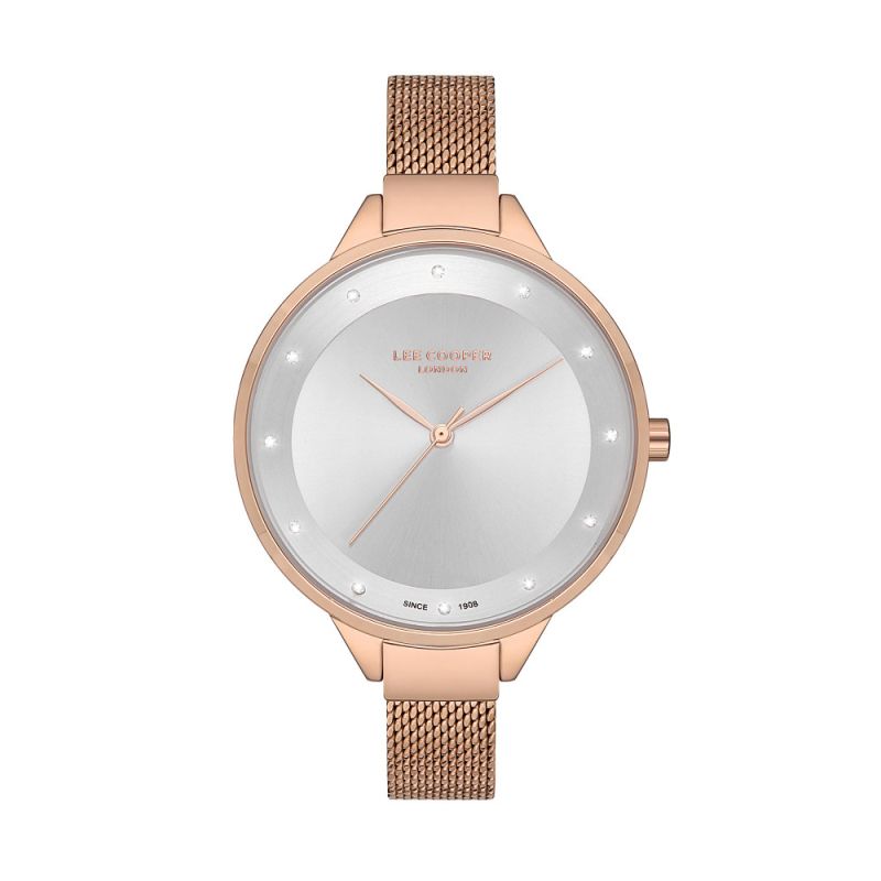 Дамски часовник Lee Cooper с модерна и интересна визия. Моделът е с корпус от супер метал. Стъкло минерал-кристал. Тънка верижка от неръждаема стомана в цвят розово злато. Аналогов дисплей с декорация от инкрустирани кристали. Кварцов механизъм. Водоустойчивост 3 ATM - допускат се леки пръски, не се препоръчва обилно мокрене.