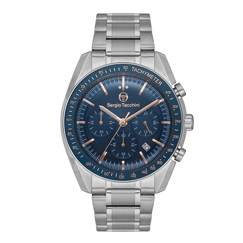 Спортно-елегантен мъжки часовник Sergio Tacchini с дисплей тип хронограф. Корпус и верижка изработени от неръждаема стомана. Минерално стъкло, устойчиво на надраскване. Кварцов механизъм. Водоустойчивост 5 ATM - допускат се леки пръски и взимане на душ, не се препоръчва обилно мокрене.