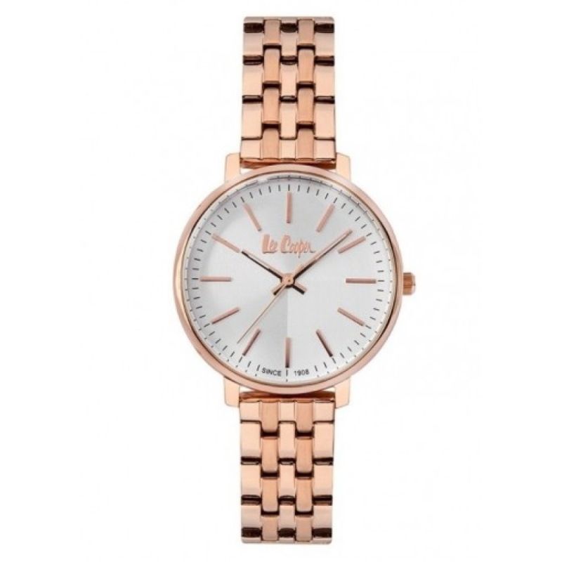 Дамски часовник Lee Cooper от колекцията Elegance. Моделът е с корпус от супер метал и има минерално стъкло. Верижка от неръждаема стомана в цвят розово злато. Аналогов сребрист дисплей. Кварцов механизъм. Водоустойчивост 3 ATM - допускат се леки пръски, не се препоръчва обилно мокрене.