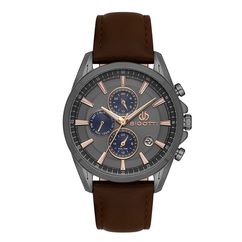 Спортно-елегантен мъжки часовник Bigotti с мултифункционален дисплей. Метален корпус в комбинация с кожена каишка. Минерално стъкло, устойчиво на надраскване. Моделът се задвижва от кварцов механизъм. Водоустойчивост 5 ATM - допускат се леки пръски и взимане на душ, не се препоръчва обилно мокрене.