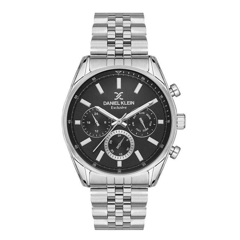Мъжки часовник Daniel Klein със спортно-ежедневен дизайн от колекцията Exclusive. Корпус изработен от висококачествена метална сплав. Верижка от неръждаема стомана. Черен мултифункционален дисплей със сребристи детайли. Луминисцентно покритие на стрелките и индексите. Минерално стъкло устойчиво към надраскване. Кварцов механизъм. Водоустойчивост 5 ATM - допускат се леки пръски и взимане на душ, не се препоръчва обилно мокрене.