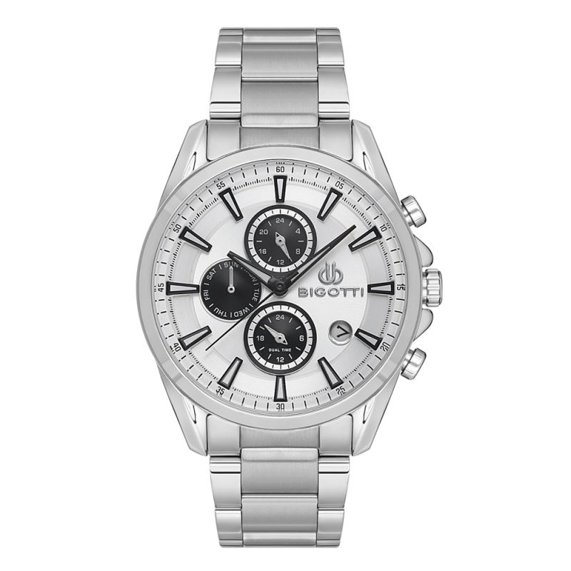 Спортно-елегантен мъжки часовник Bigotti с мултифункционален дисплей. Луминисцентно покритие на стрелките и индексите. Минерално стъкло, устойчиво на надраскване. Моделът е с метален корпус и верижка от неръждаема стомана. Задвижва се от кварцов механизъм. Водоустойчивост 5 ATM - допускат се леки пръски и взимане на душ, не се препоръчва обилно мокрене.