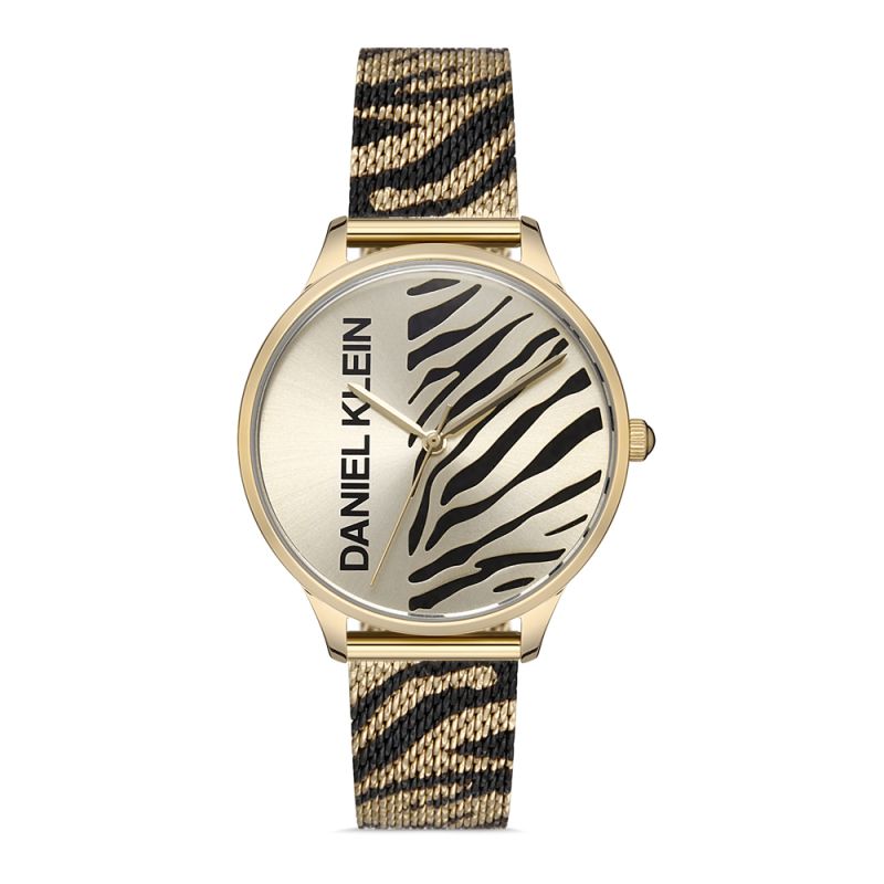 Дамски часовник Daniel Klein от колекцията Premium. Аналогов дисплей с интересен дизайн. Стъкло минерал-кристал. Моделът е с меш верижка от неръждаема стомана и метален корпус. Кварцов механизъм. Водоустойчивост 3 ATM - допускат се леки пръски, не се препоръчва обилно мокрене.