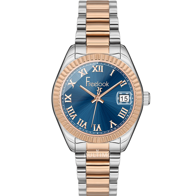 Дамски часовник Freelook от серия Belle с корпус изработен от месинг. Стъкло минерал-кристал. Верижка от неръждаема стомана. Аналогов дисплей с показател за дата. Тъмносин циферблат с розово-златисти римски цифри и стрелки. Кварцов механизъм.