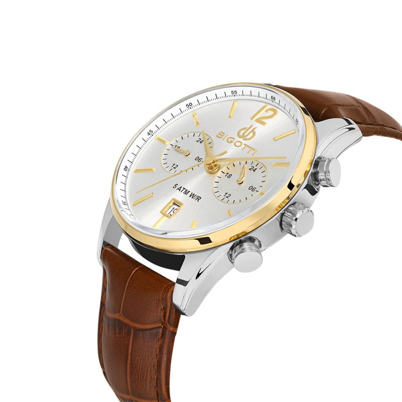 Стилен мъжки часовник Bigotti от колекцията Quotidiano. Сребрист мултифункционален дисплей с детайли в цвят злато. Минерално стъкло, устойчиво на надраскване. Метален корпус, съчетан с каишка от естествена кожа. Моделът се задвижва от кварцов механизъм. Водоустойчивост 5 ATM - допускат се леки пръски и взимане на душ, не се препоръчва обилно мокрене.