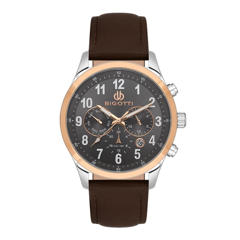 Спортно-елегантен мъжки часовник Bigotti с мултифункционален дисплей. Моделът е с метален корпус, съчетан с каишка от естествена кожа. Минерално стъкло, устойчиво на надраскване. Задвижва се от кварцов механизъм. Водоустойчивост 5 ATM - допускат се леки пръски и взимане на душ, не се препоръчва обилно мокрене.
