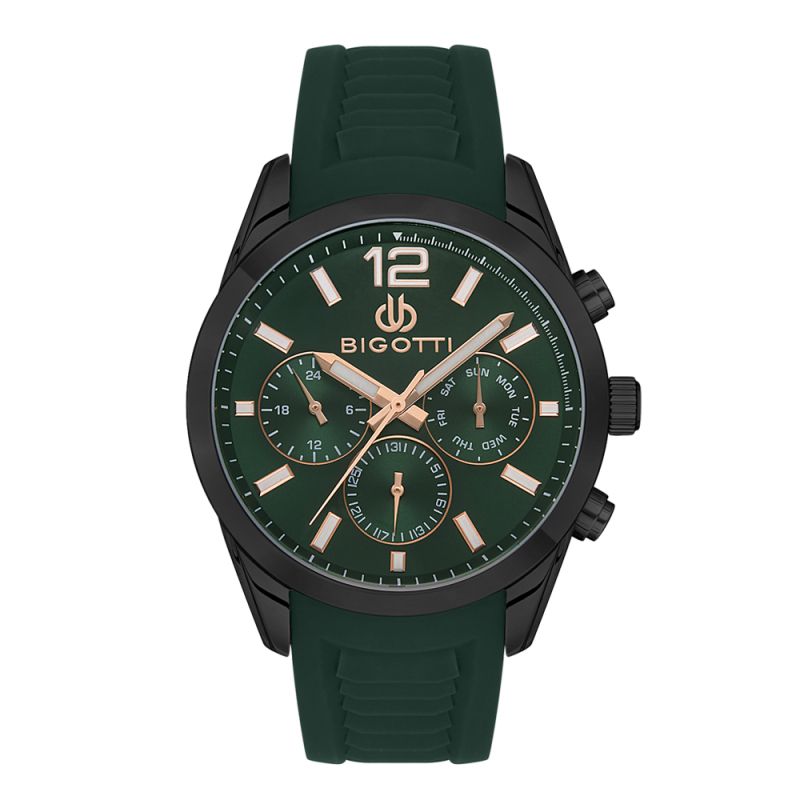 Спортен модел мъжки часовник Bigotti с мултифункционален дисплей. Минерално стъкло, устойчиво на надраскване. Метален корпус в комбинация със силиконова каишка. Задвижва се от кварцов механизъм. Водоустойчивост 5 ATM - допускат се леки пръски и взимане на душ, не се препоръчва обилно мокрене.