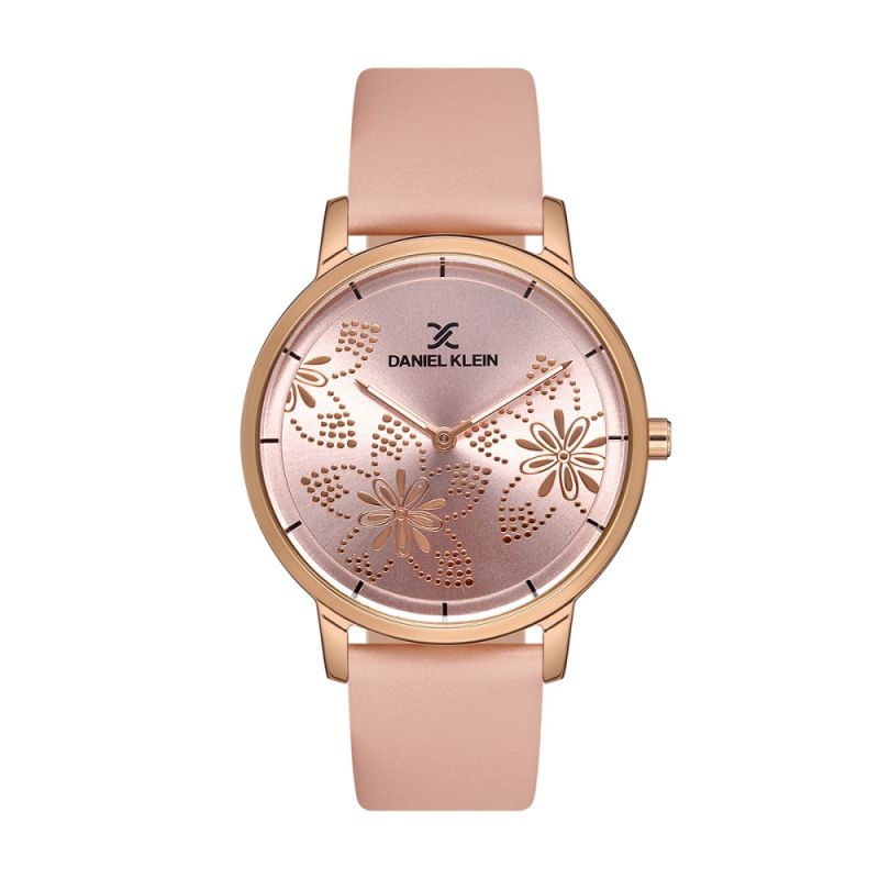 Дамски часовник Daniel Klein с впечатляваща и модерна визия от колекция Trendy. Аналогов дисплей с нежна флорална декорация. Стъкло минерал-кристал. Корпус изработен от висококачествена метална сплав. Розова каишка от естествена кожа. Кварцов механизъм. Водоустойчивост 3 ATM - допускат се леки пръски, не се препоръчва обилно мокрене.
