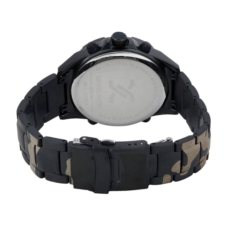 Спортно-елегантен мъжки часовник Daniel Klein от колекцията D Time. Корпус изработен от висококачествена метална сплав. Верижка от неръждаема стомана с камуфлажна шарка. Аналогов дисплей с дигитален под дисплей. Стъкло минерал-кристал. Задвижва се от кварцов механизъм. Водоустойчивост 5 ATM - допускат се леки пръски и взимане на душ, не се препоръчва обилно мокрене.