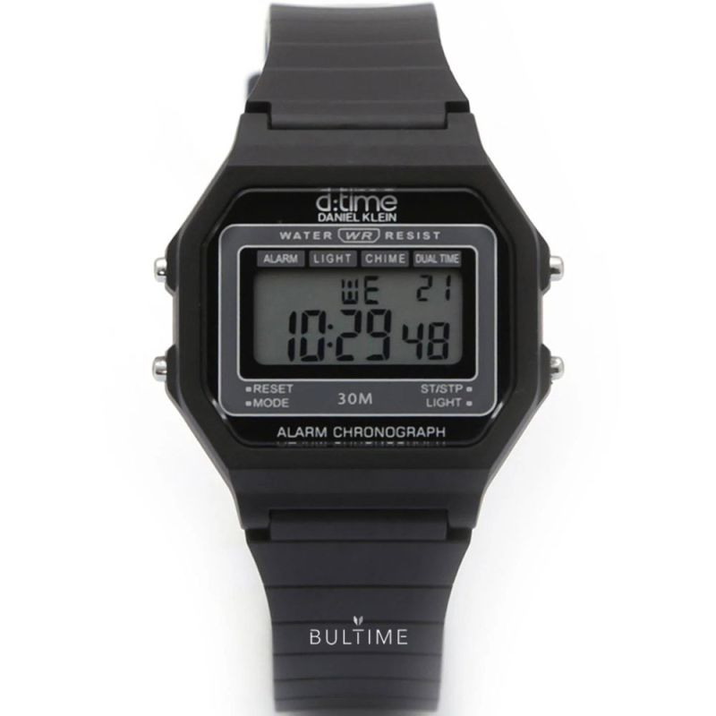 Спортен модел дамски часовник Daniel Klein от колекцията D Time. Часовникът е с корпус от полимер и силиконова каишка. Дигитален дисплей с плексигласово стъкло. Моделът има следните функции: показател за дата и ден от седмицата, 12/24 часов формат, второ време, хронограф, аларма и осветяване на дисплея. Задвижва се от кварцов механизъм. Водоустойчивост 3 ATM - допускат се леки пръски, не се препоръчва обилно мокрене.