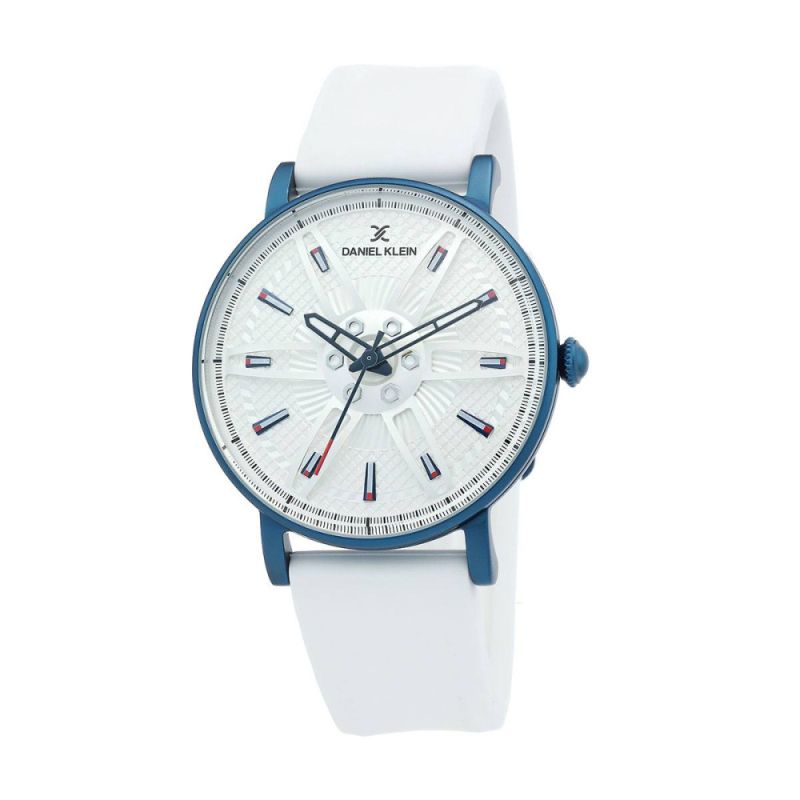 Мъжки часовник Daniel Klein от колекцията Premium. Аналогов дисплей с интересен дизайн с 3D детайли. Стъкло минерал-кристал. Корпус изработен от висококачествена метална сплав. Бяла силиконова каишка. Задвижва се от кварцов механизъм. Водоустойчивост 5 ATM - допускат се леки пръски и взимане на душ, не се препоръчва обилно мокрене.