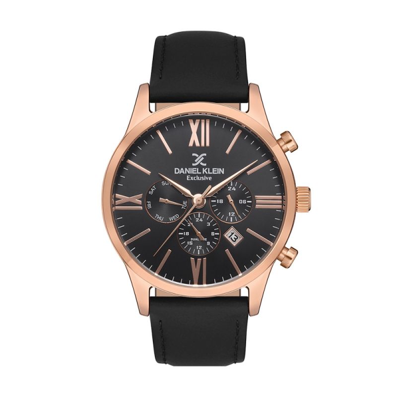 Спортно-елегантен мъжки часовник Daniel Klein от колекцията Exclusive. Моделът е с черен мултифункционален дисплей с показатели за дата, ден и двойно време. Стъкло минерал-кристал. Корпус изработен от висококачествена метална сплав. Черна каишка от естествена кожа. Задвижва се от кварцов механизъм.  Водоустойчивост 5 ATM - допускат се леки пръски и взимане на душ, не се препоръчва обилно мокрене.