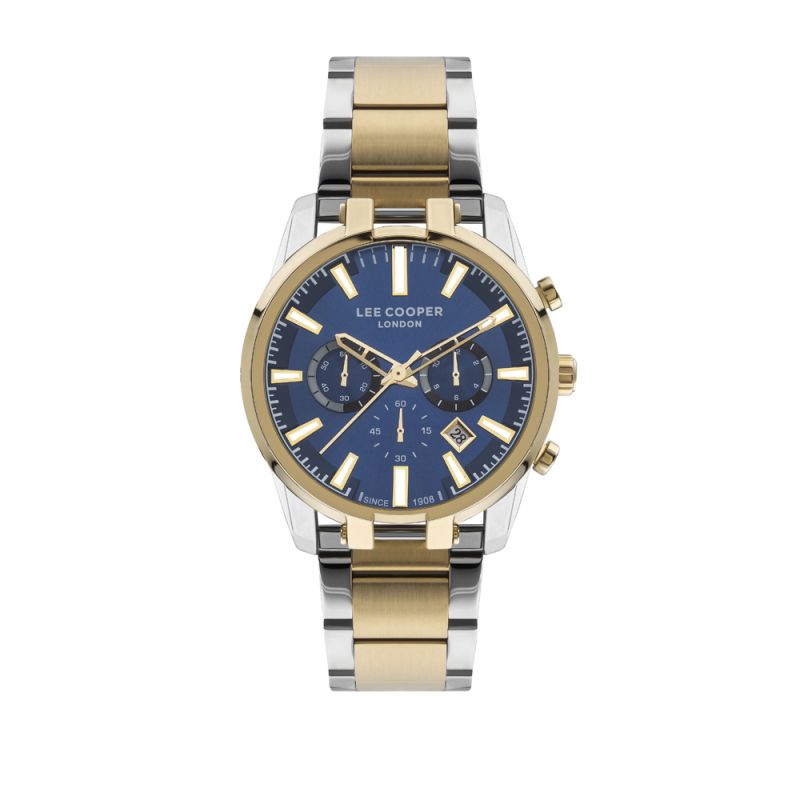 Мъжки часовник Lee Cooper със спортно-ежедневен дизайн. Син мултифункционален дисплей със стрелки и индекси в цвят злато. Корпус от супер метал. Стъкло минерал-кристал. Метална верижка. Кварцов механизъм. Водоустойчивост 5 ATM - допускат се леки пръски и взимане на душ, не се препоръчва обилно мокрене.