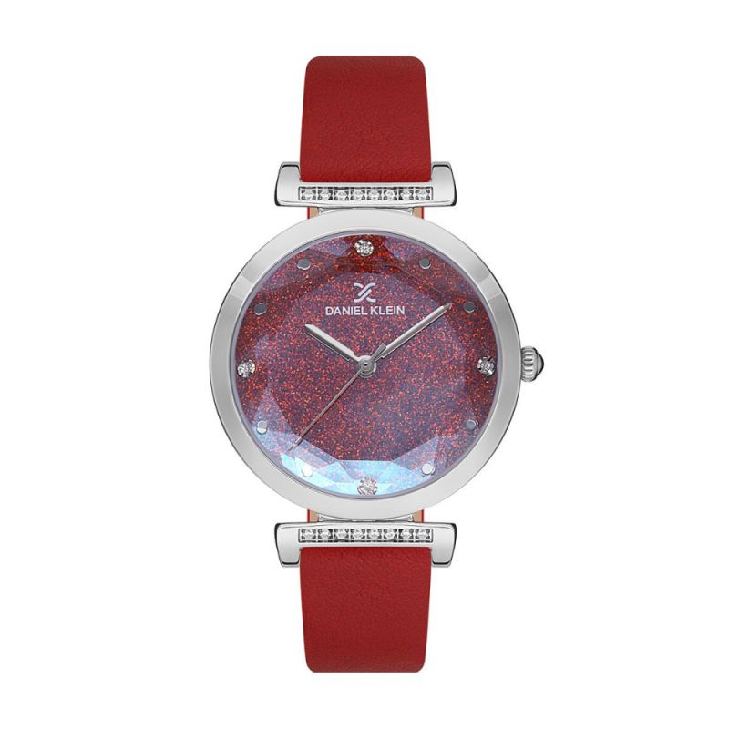 Дамски часовник Daniel Klein от колекцията Premium. Моделът е с червен аналогов дисплей с цветни детайли и нежни кристали. Стъкло минерал-кристал. Метален корпус, съчетан с каишка от естествена кожа. Кварцов механизъм. Водоустойчивост 3 ATM - допускат се леки пръски, не се препоръчва обилно мокрене.