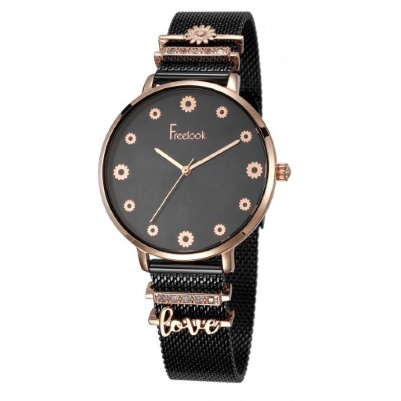 Нежен модел дамски часовник Freelook от колекцията Lumiere. Корпус от неръждаема стомана. Стъкло минерал-кристал. Стоманена черна верижка със ситна плетка с елементи с инкрустирани кристали, надпис Love и релефни цветя. Аналогов дисплей с декорация малки цветя на часовите маркери. Кварцов механизъм. Водоустойчивост 3 ATM - допускат се леки пръски, не се препоръчва обилно мокрене.