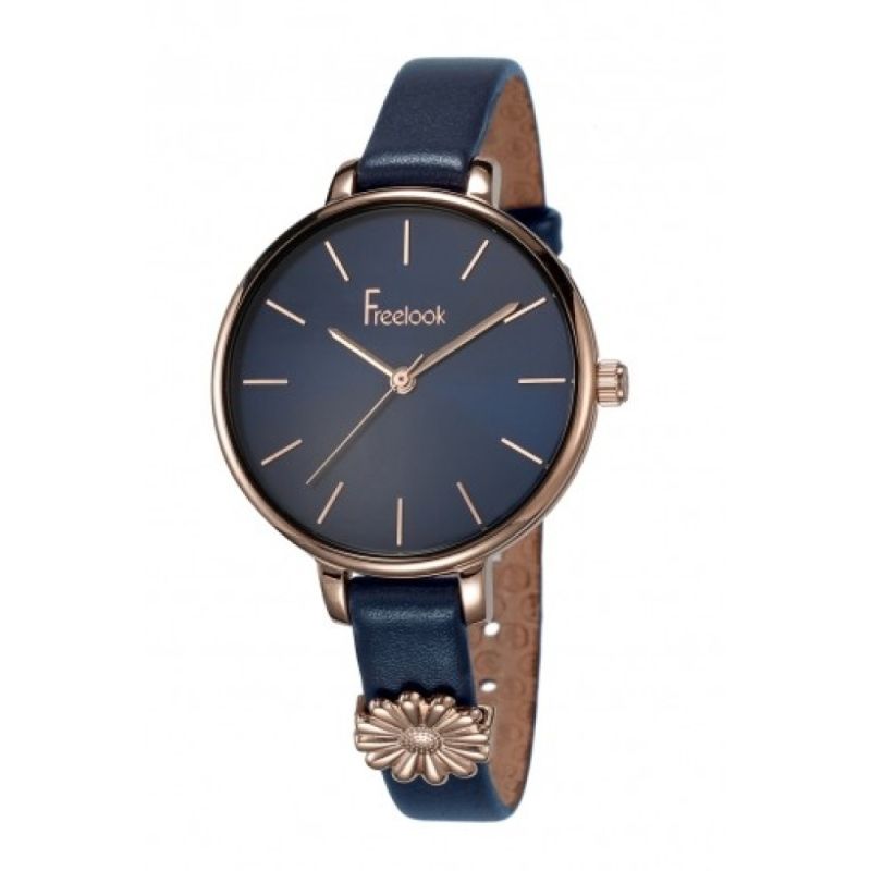 Дамски часовник Freelook от колекцията Eiffel. Корпус от неръждаема стомана. Тъмносиня кожена каишка с декорация цвете. Стъкло минерал-кристал. Кварцов механизъм. Аналогов дисплей с изчистен дизайн. Водоустойчивост 3 ATM - допускат се леки пръски, не се препоръчва обилно мокрене.