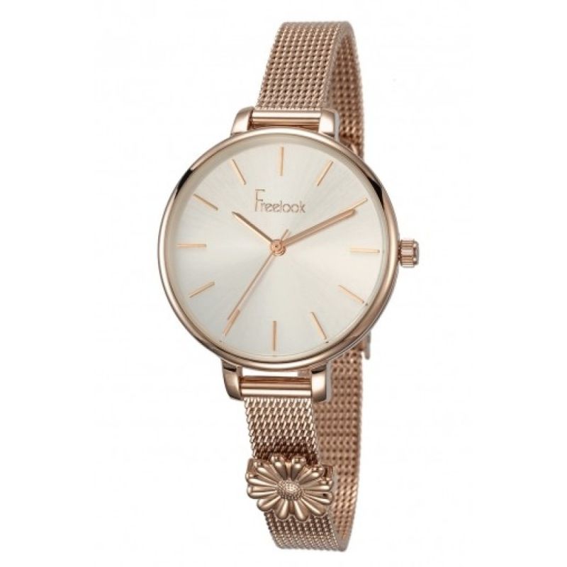 Дамски часовник Freelook от колекцията Eiffel с декорация от релефно цвете на верижката. Корпус и верижка от неръждаема стомана. Стъкло минерал-кристал. Кварцов механизъм. Аналогов дисплей с изчистен дизайн и розово-златисти стрелки и индекси. Водоустойчивост 3 ATM - допускат