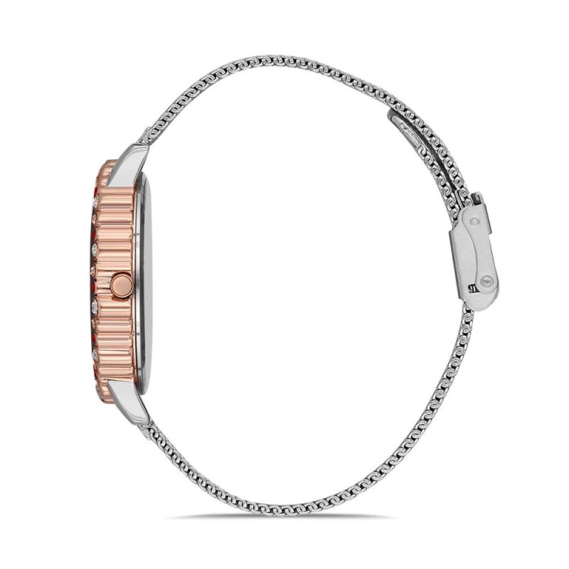 Дамски часовник Daniel Klein с модерен дизайн от колекцията Trendy. Моделът е със сребрист аналогов дисплей и декорация от кристали по ринга. Стъкло минерал-кристал. Метален корпус, съчетан с верижка от неръждаема стомана. Кварцов механизъм. Водоустойчивост 3 ATM - допускат се леки пръски, не се препоръчва обилно мокрене.