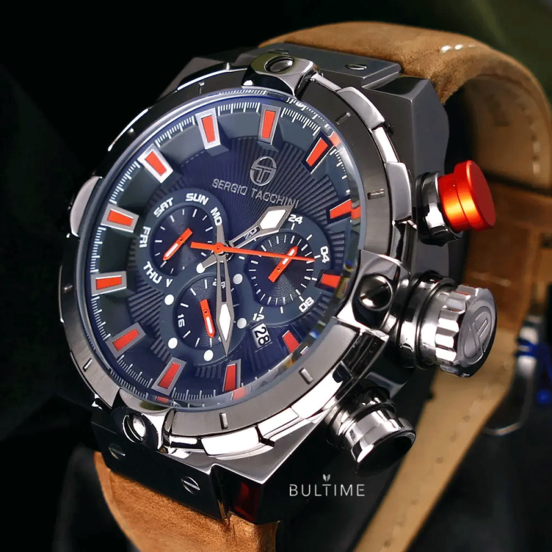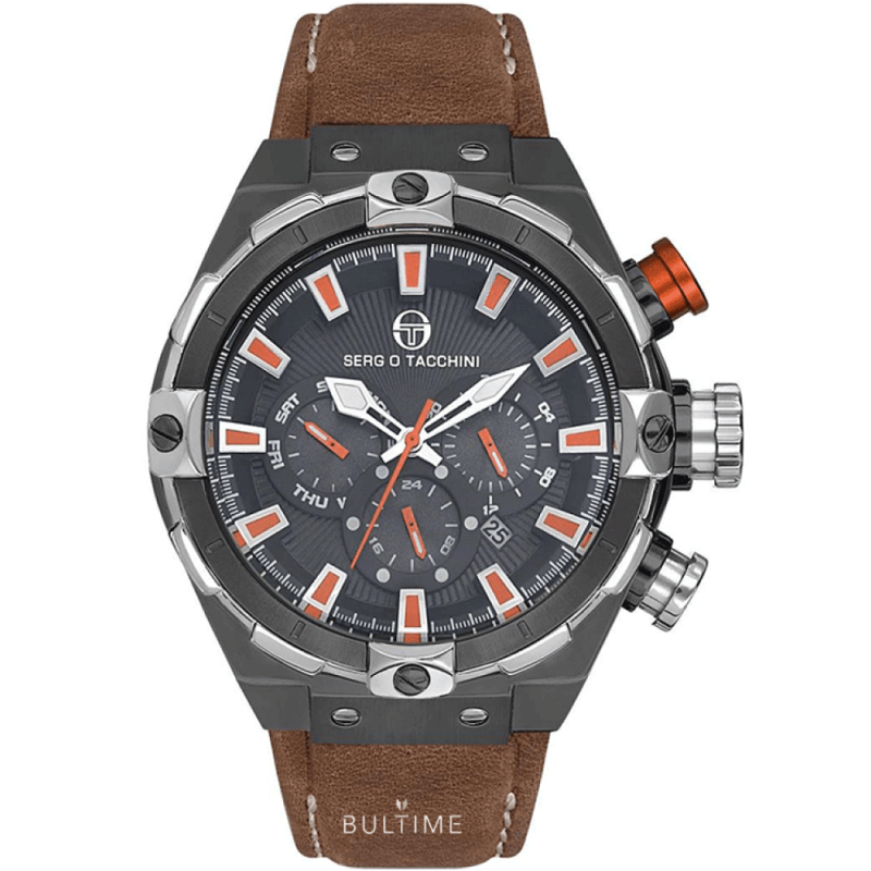 Спортно-елегантен мъжки часовник Sergio Tacchini от колекцията Heritech S. Моделът е с корпус от неръждаема стомана и каишка от естествена кожа. Тъмносив мултифункционален дисплей. Фосфоресцентно покритие на стрелките. Минерално стъкло, устойчиво на надраскване с антирефлексно покритие. Прецизен кварцов механизъм, произведен в Япония. Водоустойчивост 10 ATM - позволява мокрене, къпане и плуване във водни басейни.
