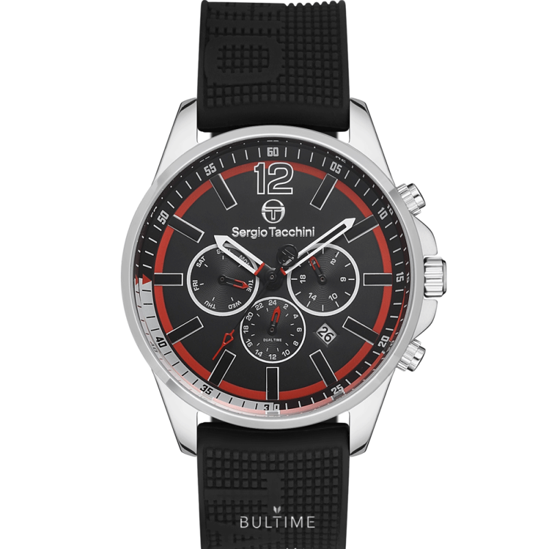 Спортен мъжки часовник Sergio Tacchini с мултифункционален дисплей от колекцията Streamline. Корпус от неръждаема стомана. Релефна силиконова каишка. Стъкло минерал-кристал. Кварцов механизъм. Водоустойчивост 5 ATM - допускат се леки пръски и взимане на душ, не се препоръчва обилно мокрене.