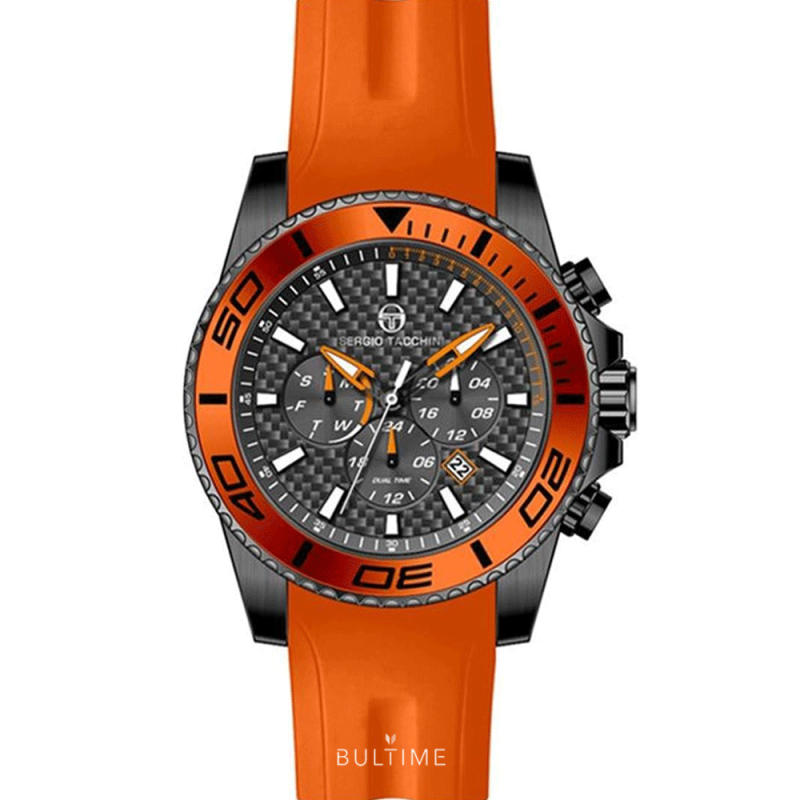 Мъжки часовник Sergio Tacchini със спортен дизайн. Мултифункционален дисплей с показатели за дата, ден и двойно време. Фосфоресциращи стрелки и индекси. Минерално стъкло с антирефлексно покритие. Корпус от неръждаема стомана, съчетан със силиконова каишка. Кварцов механизъм. Водоустойчивост 10 ATM - позволява мокрене, къпане и плуване във водни басейни.