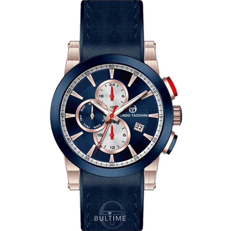 Мъжки часовник Sergio Tacchini със син мултифункционален дисплей. Минерално стъкло с антирефлексно покритие. Корпус от неръждаема стомана, съчетан с каишка от естествена кожа. Кварцов механизъм. Водоустойчивост 5 ATM - допускат се леки пръски и взимане на душ, не се препоръчва обилно мокрене.
