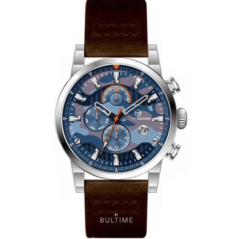 Мъжки часовник Sergio Tacchini от колекцията Heritech Dual Time. Моделът е с мултифункционален дисплей в син камуфлажен цвят с показатели за дата, ден и двойно време. Фосфоресциращи стрелки и индекси. Минерално стъкло с антирефлексно покритие. Корпус от неръждаема стомана. Кафява каишка от естествена кожа. Кварцов механизъм. Водоустойчивост 10 ATM - позволява мокрене, къпане и плуване във водни басейни.