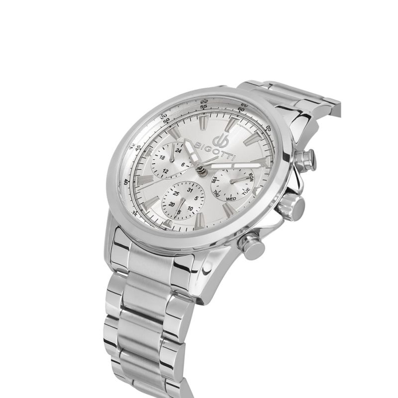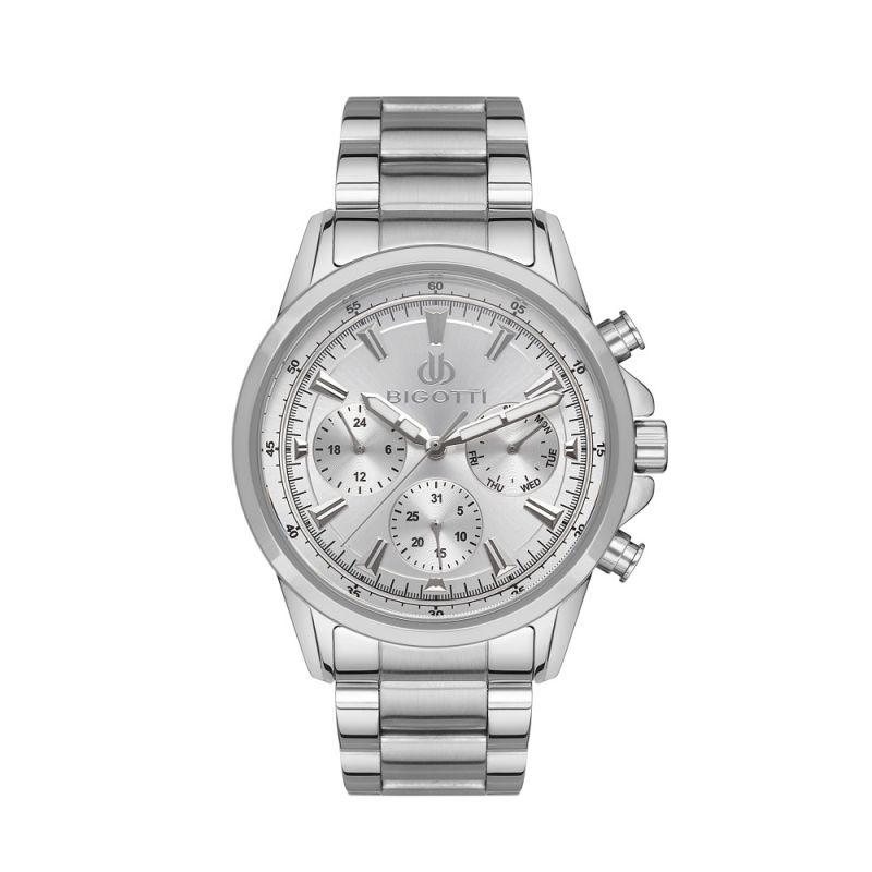 Мъжки часовник Bigotti с модерен спортно-елегантен дизайн от колекцията Milano. Сребрист мултифункционален дисплей. Луминисцентно покритие на стрелките. Минерално стъкло, устойчиво на надраскване. Метален корпус в комбинация с верижка от неръждаема стомана. Задвижва се от кварцов механизъм. Водоустойчивост 5 ATM - допускат се леки пръски и взимане на душ, не се препоръчва обилно мокрене.